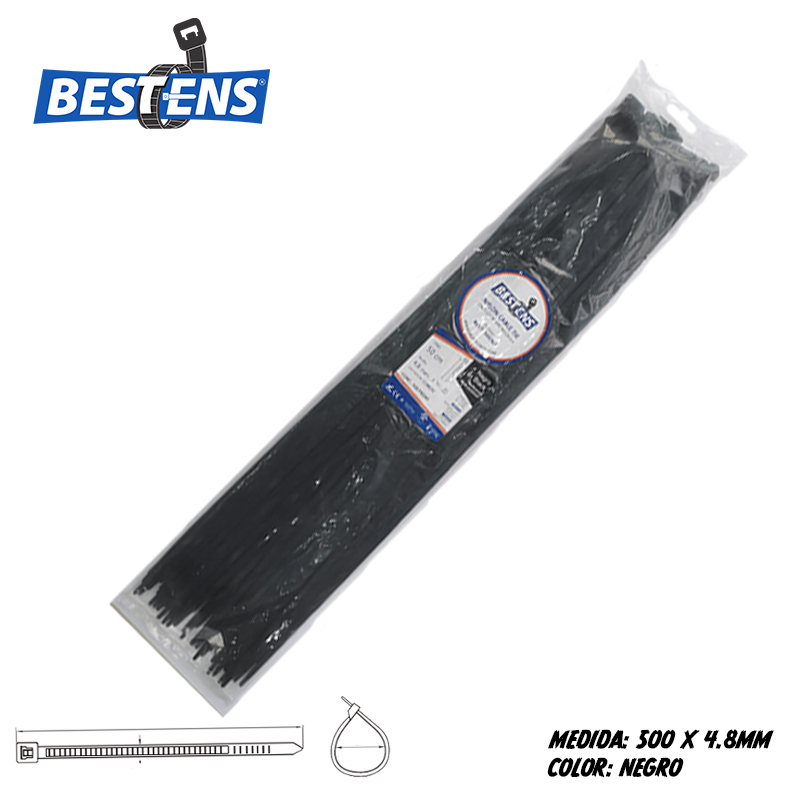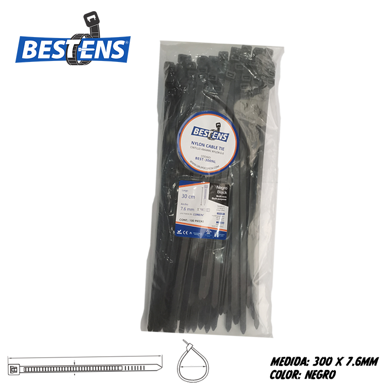 Cintillo de nylon 6.6 (ul) de amarre 300×7.6mm (30cm) 12″ negro x 100pz