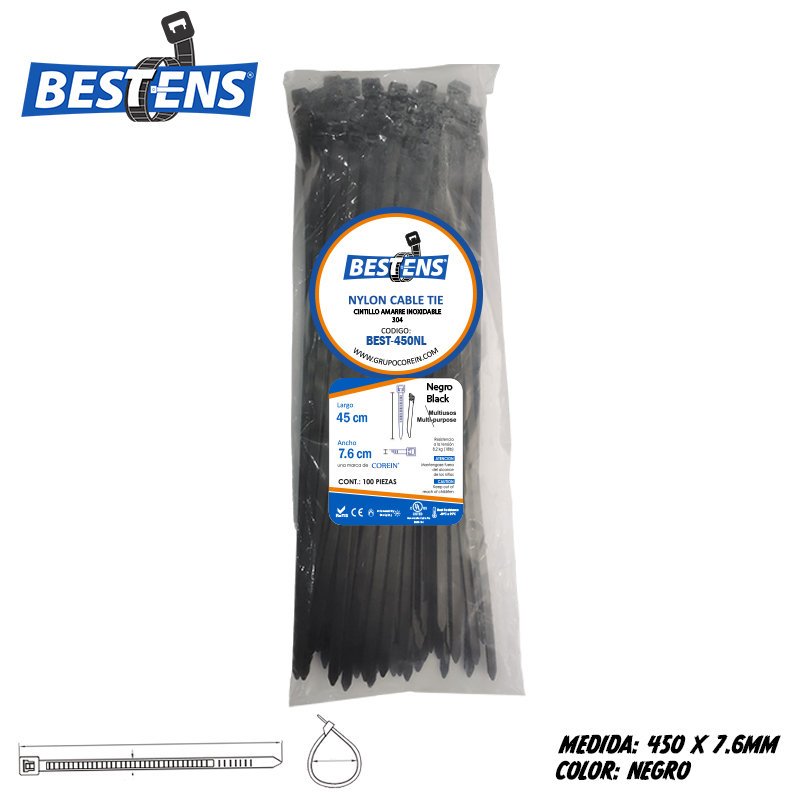 Cintillo de nylon 6.6 (ul) de amarre 450×7.6mm (45cm) 17 3/4″ negro x 100pz