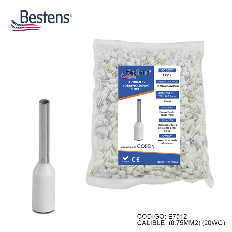Terminal sobremoldeado tubular amarillo (dim. 12.0) cable #18 awg (1.0mm2) x 100u