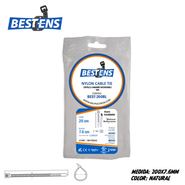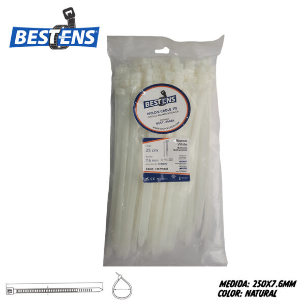 Cintillo de nylon 6.6 (ul) de amarre 250x7.6mm (30cm) 10" natural x 100pz