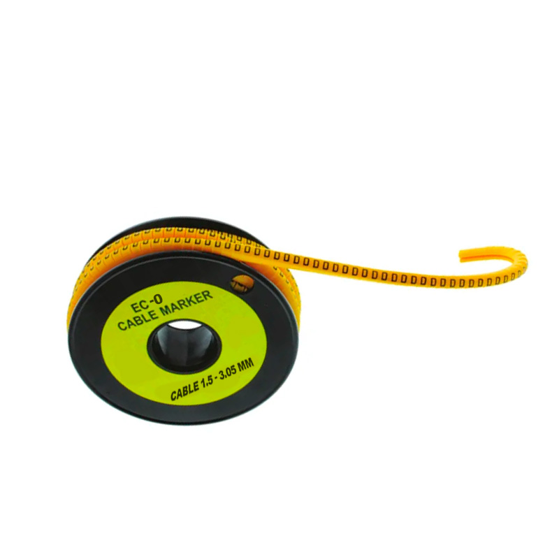 Marcadores de cable amarillos en forma de aro (modelo EC-0 con signo «-«), para cables de 1.5 a 3.05 mm de diámetro, en paquetes de 1000 unidades.