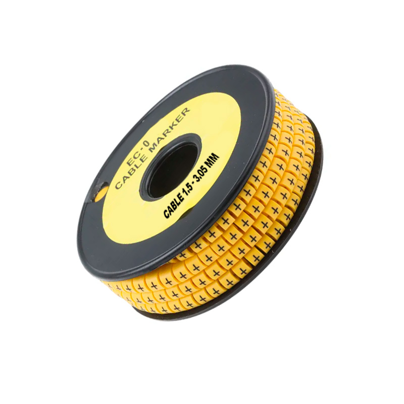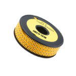 Marcadores de cable amarillos en forma de aro (modelo EC-0 con signo «/»), para cables de 1.5 a 3.05 mm de diámetro, en paquetes de 1000 unidades.