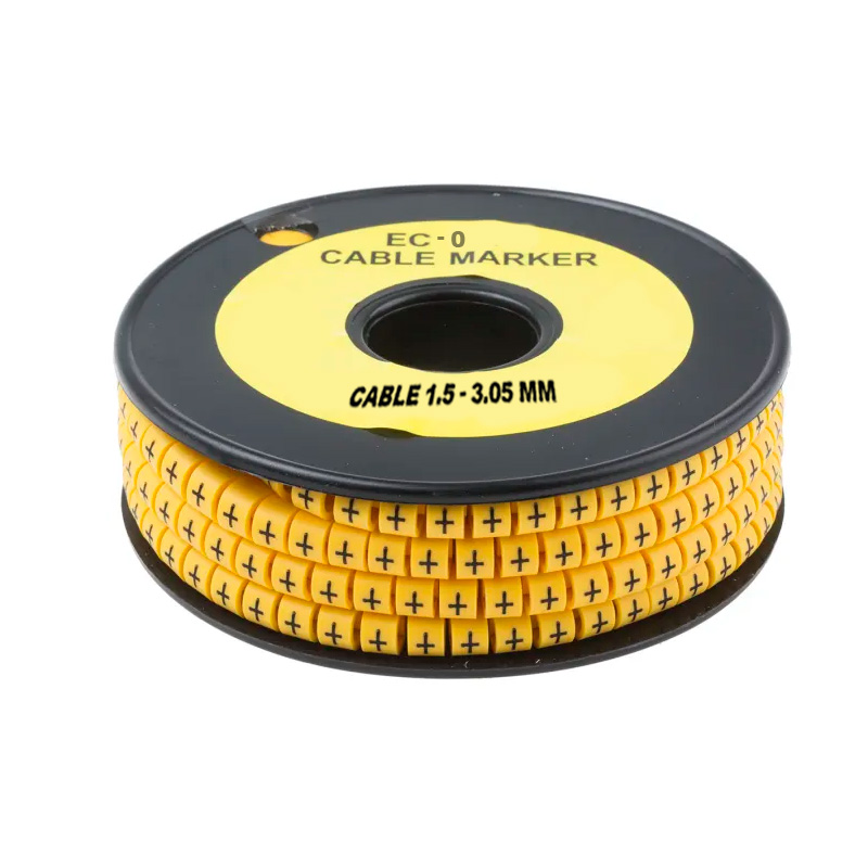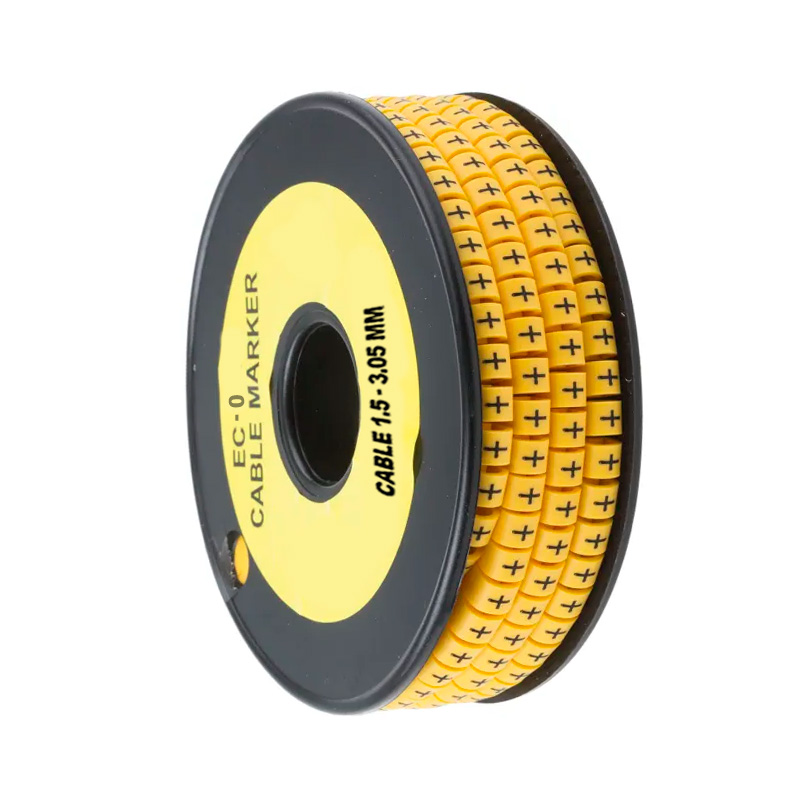 Marcadores de cable amarillos en forma de aro (modelo EC-0 con signo «+»), para cables de 1.5 a 3.05 mm de diámetro, en paquetes de 1000 unidades.