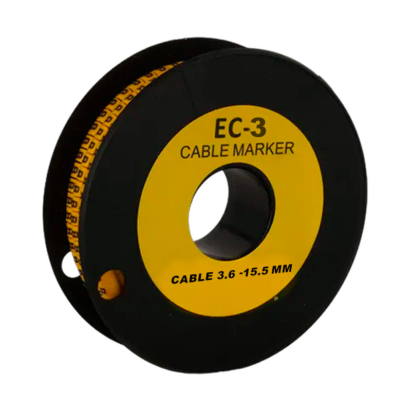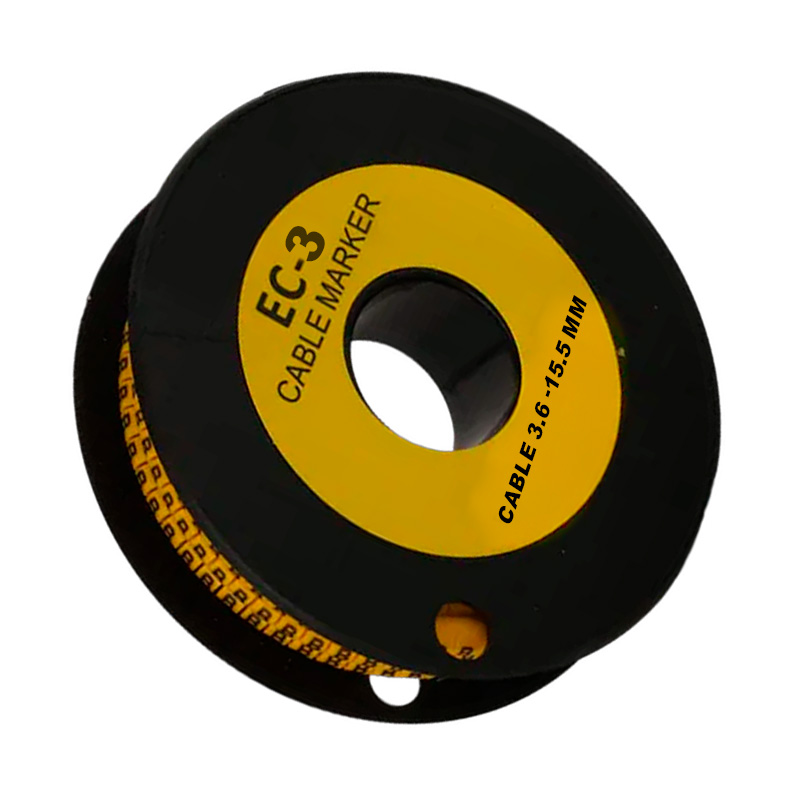 Marcador tipo aro EC-3 letra (K), diseñado para identificar de forma clara y ordenada cables con un diámetro de 3.6 a 15.5 mm. Fabricado en material plástico flexible y resistente al desgaste, aceite, humedad y temperaturas elevadas. Su color amarillo brillante garantiza alta visibilidad, y la impresión de la letra “K” permite una codificación efectiva en instalaciones eléctricas e industriales. Se presenta en rollo de 350 unidades, ideal para trabajos continuos y profesionales.