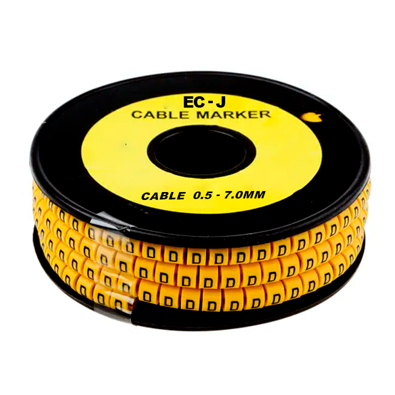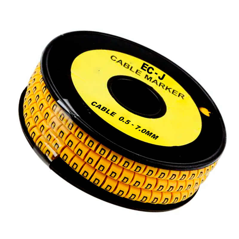 Marcador tipo plano EC-J con letra (B), ideal para la identificación de cables de 0.5 a 7.0 mm de diámetro. Fabricado en material resistente de color amarillo, diseñado para aplicaciones eléctricas e industriales. Presentación en paquetes de 500 unidades.
