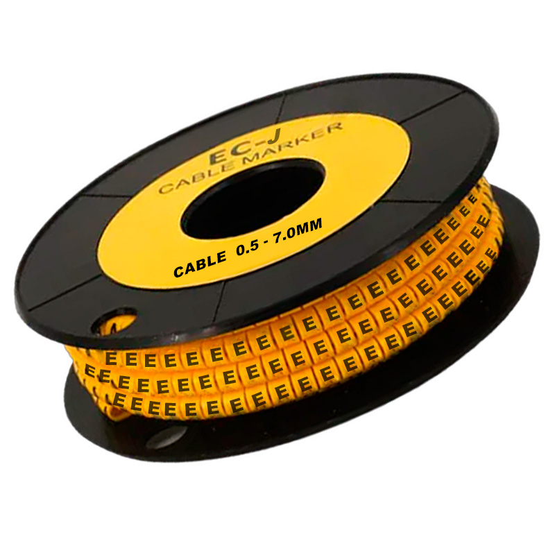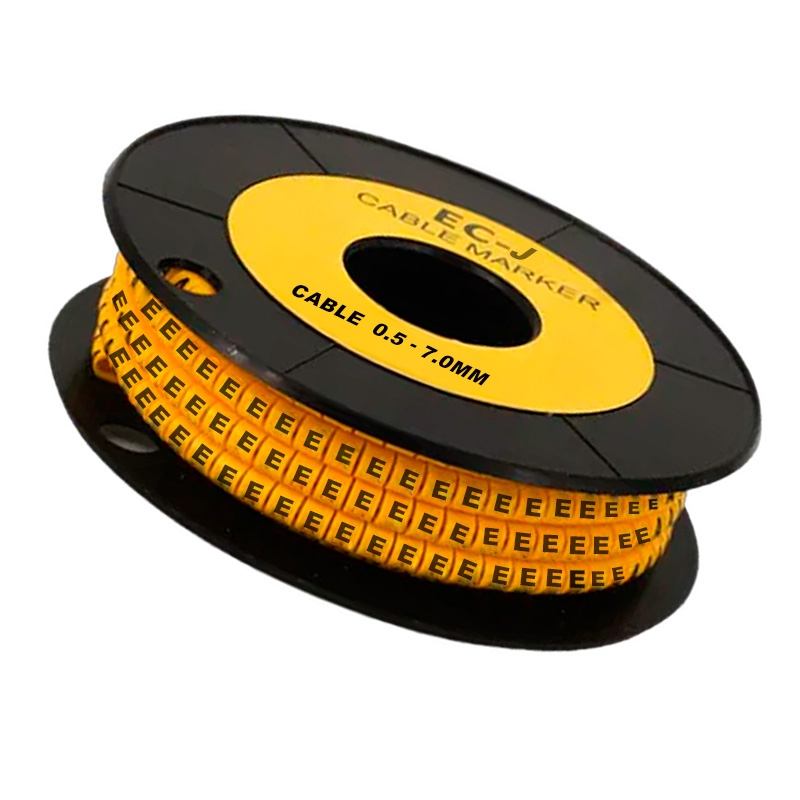 Marcador tipo plano EC-J con letra (H), ideal para la identificación de cables de 0.5 a 7.0 mm de diámetro. Fabricado en material resistente de color amarillo, diseñado para aplicaciones eléctricas e industriales. Presentación en paquetes de 500 unidades.