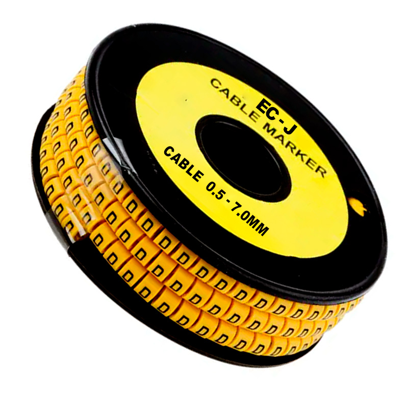 Marcador tipo plano EC-J con letra (L), ideal para la identificación de cables de 0.5 a 7.0 mm de diámetro. Fabricado en material resistente de color amarillo, diseñado para aplicaciones eléctricas e industriales. Presentación en paquetes de 500 unidades.
