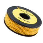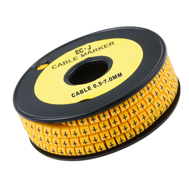 Marcador tipo plano EC-J con SIGNO (BLANCO), ideal para la identificación de cables de 0.5 a 7.0 mm de diámetro. Fabricado en material resistente de color amarillo, diseñado para aplicaciones eléctricas e industriales. Presentación en paquetes de 500 unidades.