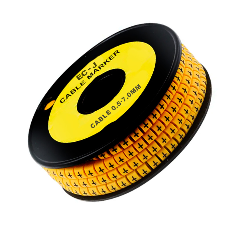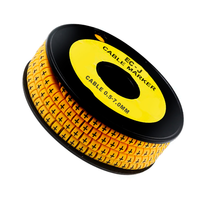 Marcador tipo plano EC-J con SIGNO (TIERRA), ideal para la identificación de cables de 0.5 a 7.0 mm de diámetro. Fabricado en material resistente de color amarillo, diseñado para aplicaciones eléctricas e industriales. Presentación en paquetes de 500 unidades.