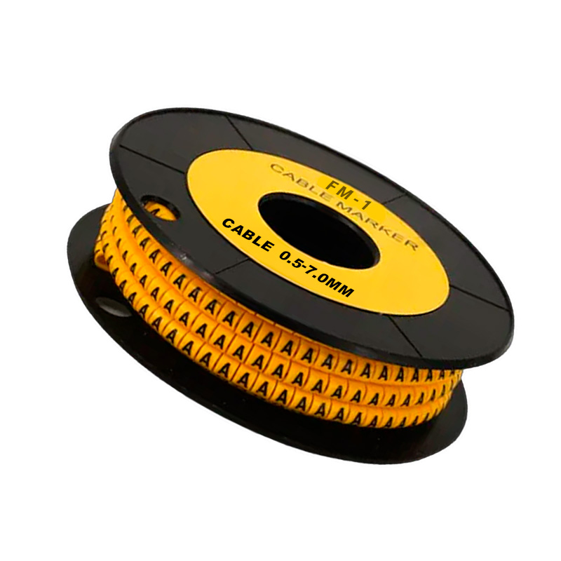 Marcador tipo plano FM con letra (A), ideal para la identificación rápida y ordenada de cables eléctricos, de red o telecomunicaciones. Compatible con diámetros de cable entre 0.5 y 7.0 mm. Fabricado en material resistente, color amarillo de alta visibilidad. Presentación en empaque de 500 unidades, pensado para uso profesional en instalaciones eléctricas o sistemas de cableado estructurado.