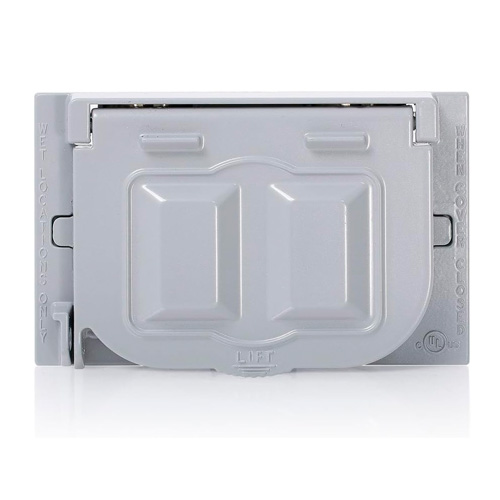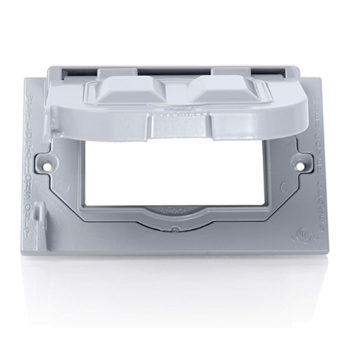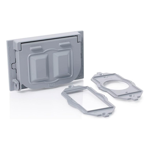 Cubierta resistente al clima de montaje horizontal de una unidad, para ICFT, Receptáculo único y receptáculo dúplex, Caja metálica, Tapa plana, Incluye insertos para ICFT, Instalaciones de receptáculo único y receptáculo dúplex, Cubierta resistente al clima, Empaque resistente al clima y tornillos de montaje – GRIS