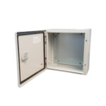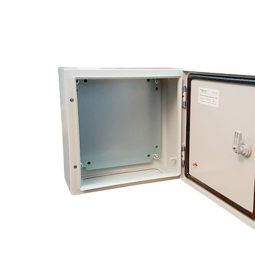Tablero metálico para adosar (200x200x150 mm), IP66, RAL7035, con placa base. Ideal para entornos exigentes.