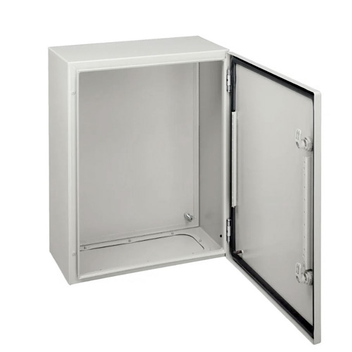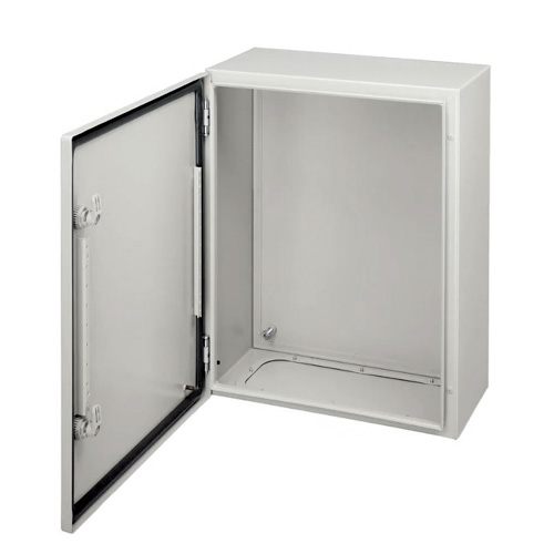 Tablero metálico adosable, 300x250x200mm, con placa base, IP66, RAL7035.