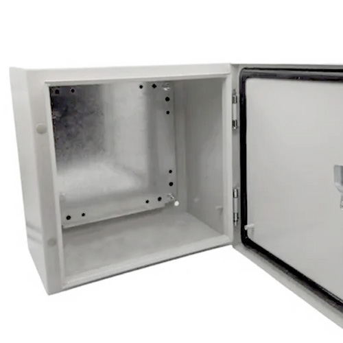 Tablero metálico adosable, 300x300x200mm, con placa base, IP66, RAL7035.