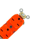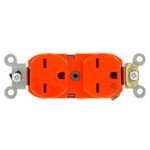 Receptáculo dúplex de 20 A, 250 V, NEMA 6-20R, 2P, 3W, serie industrial, grado de especificación para trabajo pesado, hoja recta, conexión a tierra aislada, cableado pasante de 8 orificios posterior y lateral, correa de acero, color naranja