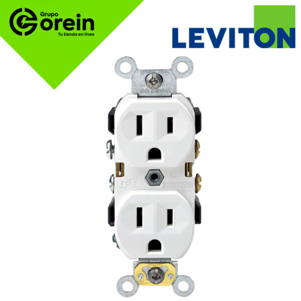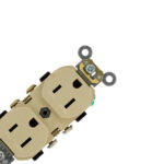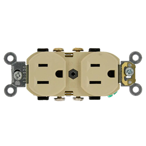 Receptáculo dúplex de cuerpo estrecho, 15 A, 125 V, NEMA 5-15R, 2P, 3W, hoja recta, grado comercial, conexión a tierra automática, cableado lateral, correa de acero, color marfil