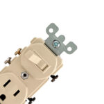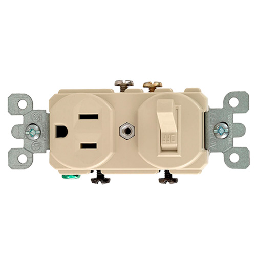 15 A, 120 V, Interruptor de combinación de CA unipolar de estilo dúplex/5-15R, uso comercial, conexión a tierra, cableado lateral, – Marfil
