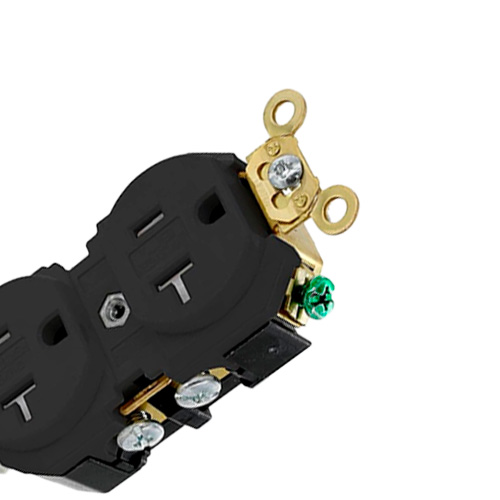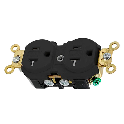 Receptáculo dúplex/tomacorriente, Grado de especificación industrial para trabajos extrapesados, Superficie suave, 15 A, 125 V, Cableado posterior y lateral, NEMA 515R, dos polos, 3 conductores, puesta a tierra automática – Negro