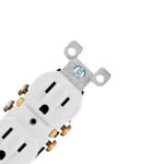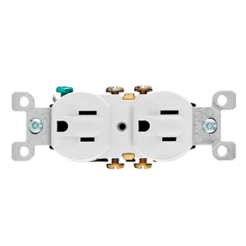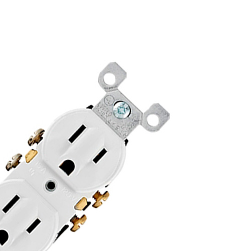 15 A, 125 V, NEMA 5-15R, 2P, 3W, Receptáculo dúplex con pestañas, hoja recta, uso residencial, conexión a tierra, todos los tornillos sin apretar, paquete del contratista, Con cableado a presión y lateral Quickwire, correa de acero, – Blanco