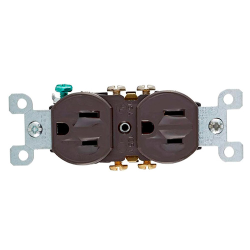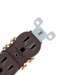 2P, 3W, Receptáculo dúplex con pestañas, hoja recta, uso residencial, Conexión a tierra, Todos los tornillos sin apretar, paquete del contratista, Con cableado a presión y lateral Quickwire, correa de acero, Brown
