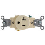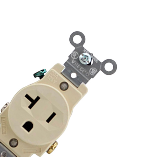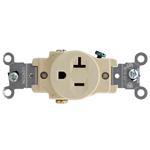 20 A, 125 V, NEMA 520R, 2P, 3W, Receptáculo único de cuerpo estrecho, hoja recta, uso comercial, Conexión a tierra, , , Cableado lateral, correa de acero,, marfil